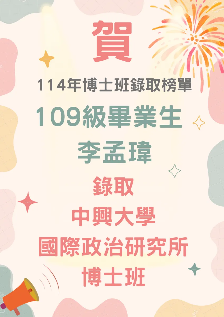 賀!本系畢業生114年博士班錄取榜單 (114年7月18日公告)