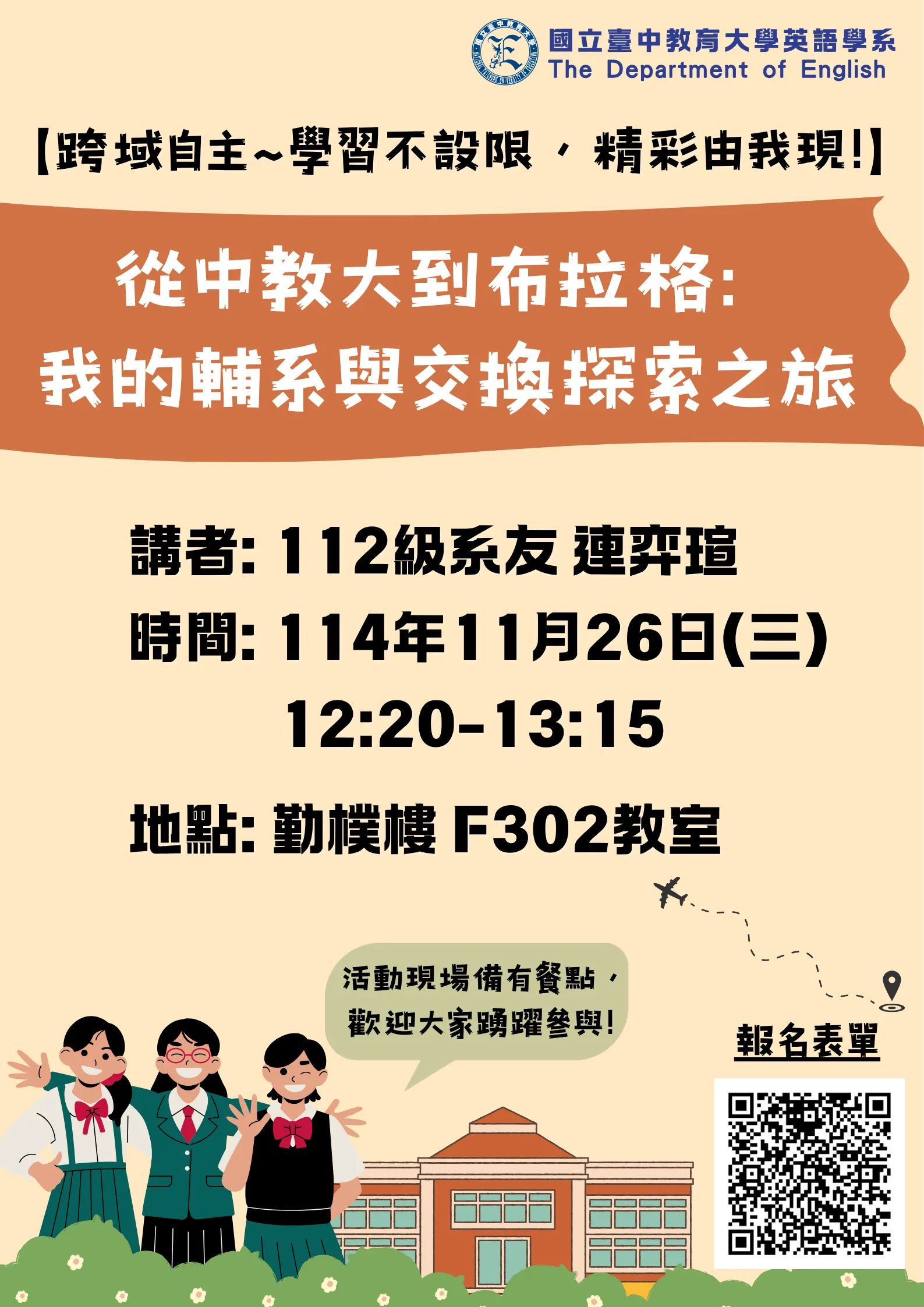 講者: 112級系友 連弈瑄時間: 114年11月26日(三) 12:20-13:15地點: 勤樸樓 F302教室活動現場備有餐點,歡迎大家踴躍參與!!!檔案下載【跨域自主~學習不設限,精彩由我現!】講座活動_(114年10月31日公告).webpWEBP【跨域自主~學習不設限,精彩由我現!】講座活動_(114年10月31日公告).webpWEBP