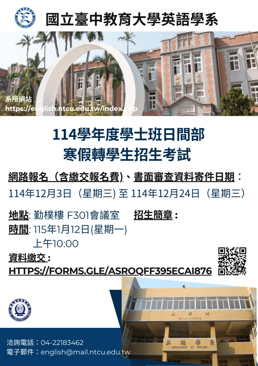 報名時間自114年12月3日(星期三)上午10時至114年12月24日(星期三)24時,報名網址https://mdpt.ntcu.edu.tw/recruit/signup/,逾期不受理。書審資料上傳時間為114年12月24日(星期三)24時止,以系統呈現上傳時間為準,表單填寫一人僅限上傳一次(本系連結:https://forms.gle/uSC84GDFib4H7h358),每人僅限填寫一次。電子郵件請與報名系統及個人資料填寫一致,將為受理書審文件標準,否則不予受理。請務必使用本系連結上傳,並請查閱附件本校簡章11頁內容。